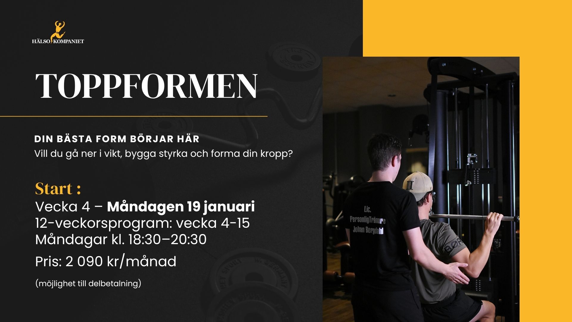 Toppformen är ett exklusivt 12-veckorsprogram för dig som vill ta din träning och hälsa till nästa nivå. Med tydlig coachning, inspirerande gemenskap och mätbara resultat hjälper vi dig att nå din toppform – på riktigt!